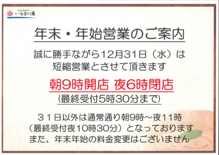 年末年始の営業は12月31日(水)のみ朝9時~夜6時(最終受付 夕方5時30分)